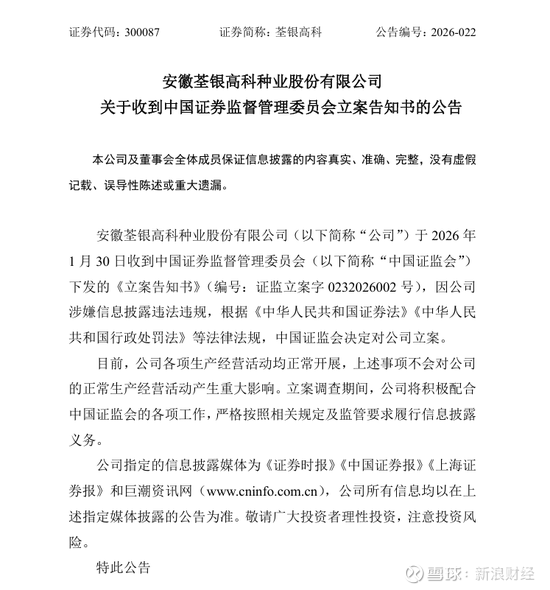 此外,荃银高科(300087.SZ)公告称,公司于2026年1月30日收到中国证监会下发的《立案告知书》,因公司涉嫌信息披露违法违规,中国证监会决定对公司立案。目前公司生产经营正常,立案调查不会对公司正常生产经营活动产生重大影响。公司将积极配合中国证监会的工作,严格履行信息披露义务。
