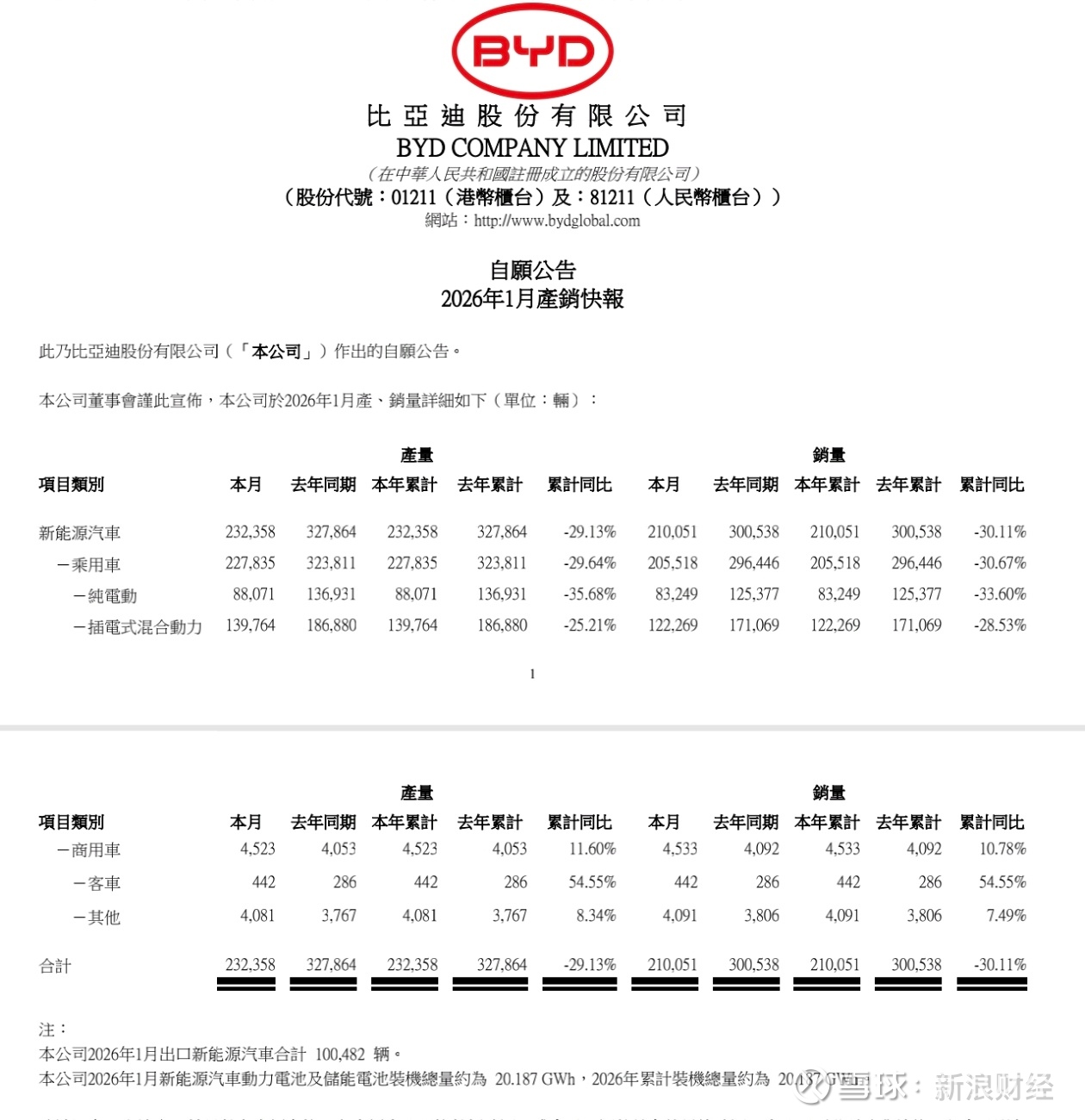 上证报中国证券网讯(记者 黎灵希)2月1日晚间,比亚迪股份在港交所公告,2026年1月,新能源汽车产量232358辆,同比下降29.13%;新能源汽车销量210051辆,同比下降30.11%。