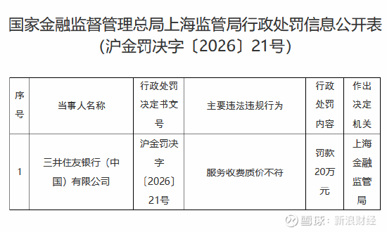 三井住友银行(中国)因服务收费质价不符被罚20万元