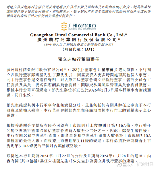 2月3日金融一线消息,广州农商银行发布公告,本行独立非执行董事郑国坚先生,因需要投入更多时间处理其他个人事务,向本行董事会递交辞任声明,辞去第四届董事会独立非执行董事、审计委员会主任委员及委员、提名与薪酬委员会委员、关联交易与风险管理委员会委员职务。根据本行公司章程规定,郑先生辞任事宜已于2026年2月3日经本行董事会审议通过,同日生效。