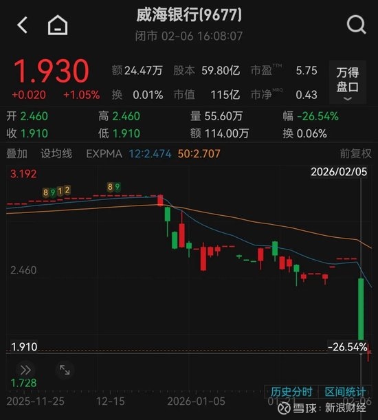 2026年2月5日,当A股银行板块整体反弹之际,威海银行却遭遇了一场罕见的暴跌。股价单日下跌26.54%,收盘报1.91港元,创下该行自2020年上市以来的最低水平。