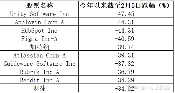 Choice数据显示,今年以来截至2月5日,美股市场多只软件股股价跌幅超过30%。其中,Unity Software、Applovin、Figma等个股年初以来跌幅超过40%。