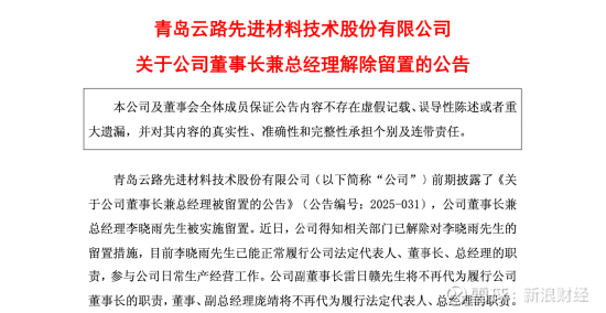 公告显示,公司近日获悉相关部门已解除对李晓雨的留置措施,其目前已能正常参与公司日常生产经营工作。此前代为履职的副董事长雷日赣、董事兼副总经理庞靖同步“卸任”代理身份,公司治理结构恢复原状。
