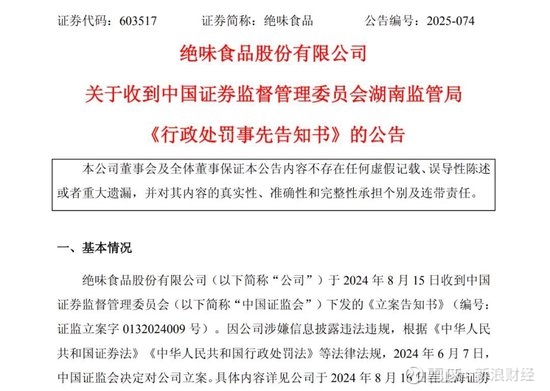 绝味食品股份有限公司关于收到中国证券监督管理委员会湖南监管局《行政处罚事先告知书》的公告