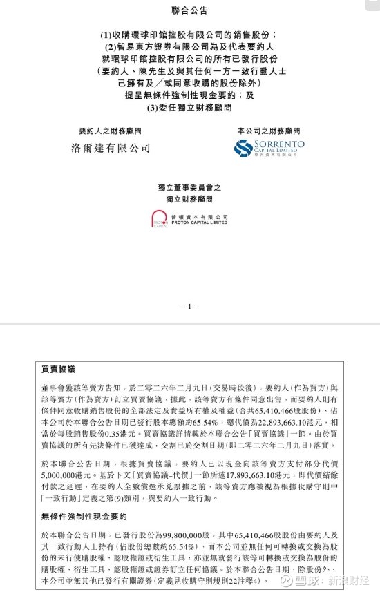 2月10日,日前,港股上市公司环球印馆发布公告,宣布知名酒类连锁企业“名品世家”董事长陈明辉,通过其全资持有的Digital Intelligence Holdings Limited,正式收购公司约65.54%的股份,交易总代价约2289万港元(约合人民币2024.25万元)。
