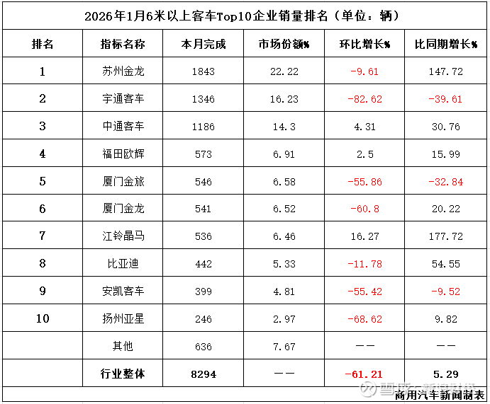 中国客车统计信息网数据显示,2026年1月,6米以上客车市场共销售8294辆,环比下降61.21%,同比增长5.29%,呈现出“环比降、同比增”的态势。