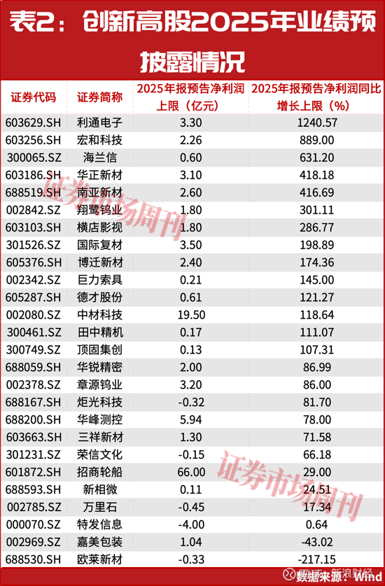 二是有业绩支撑背书。据笔者进一步梳理,这57只个股截至目前共有26只发布了2025年业绩预告,其中24只的预告净利润同比增长上限为正值,即在2025年大概率将实现业绩的同比增长,14只业绩增速将有可能翻倍,尤其是利通电子,预告净利润同比增长上限高达1240.57%(见表2)。