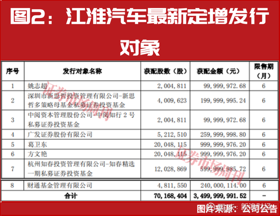 据上市公司公告,江淮汽车于2月11日公布了《向特定对象发行股票发行情况报告书》,其中定增发行对象共有8位,葛卫东以及章建平的夫人方文艳赫然在列,并分别斥资近10亿元。此外,章建平参股的杭州知春投资管理有限公司同样斥资近6亿元(见图2)。