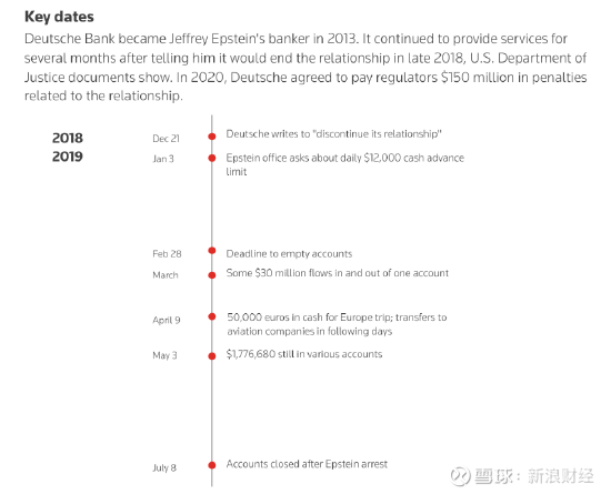 路透对美国文件的审查显示,截至2019年5月3日,爱泼斯坦在这家德国最大银行仍持有至少9个账户,余额共计1776680美元。