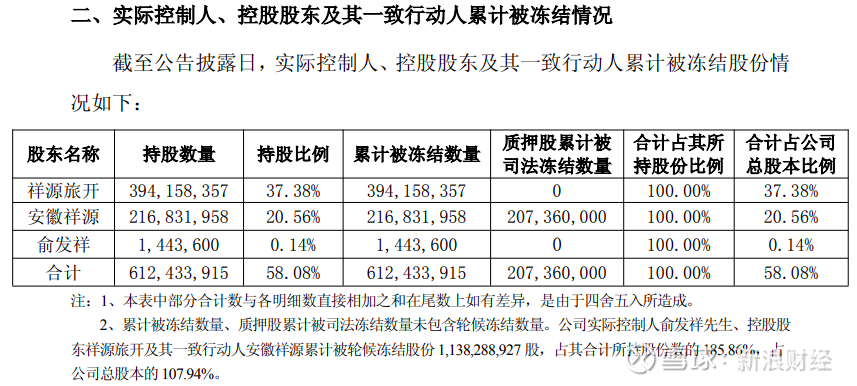 公告显示,截至公告披露日,公司实际控制人、控股股东祥源旅游开发有限公司(以下简称“祥源旅开”)及其一致行动人安徽祥源文化发展有限公司(以下简称“安徽祥源”)合计持有公司股份612,433,915股,占公司总股本的58.08%。公司实际控制人、控股股东祥源旅开及其一致行动人安徽祥源累计被司法冻结股份612,433,915股,占其合计所持股份数的100%,占公司总股本的58.08%;被轮候冻结股份1,138,288,927股,占其合计所持股份数的185.86%,占公司总股本的107.94%;被司法冻结质押207,360,000股,占其合计所持股份数的33.86%,占公司总股本的19.66%。