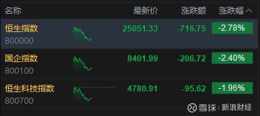 3月4日消息,港股三大指数低开低走。截至午间收盘,恒生指数跌2.78%,报25051.33点,恒生科技指数跌1.96%,国企指数跌2.4%。盘面上,科网股普跌,阿里巴巴、京东跌超4%,哔哩哔哩跌超3%,百度、快手、联想跌超2%;油气设备与服务股回调,百勤油服跌超25%;黄金股普跌,紫金黄金国际跌超4%;保险股下挫,中国人寿跌超6%。