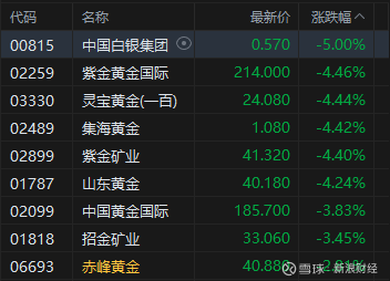 黄金股普跌,紫金黄金国际跌超4%。昨日晚间,黄金、白银双双跳水。COMEX黄金期货盘中跳水跌超5%,现货黄金一度跌超6%,盘中跌破5000美元关口;COMEX白银期货一度跌超12%。华泰期货指出,中东冲突持续蔓延,能源价格持续攀升,重新点燃市场通胀担忧。交易员押注美联储年内二次降息概率降至50%,降息门槛显著抬高,对贵金属价格形成明显压制。