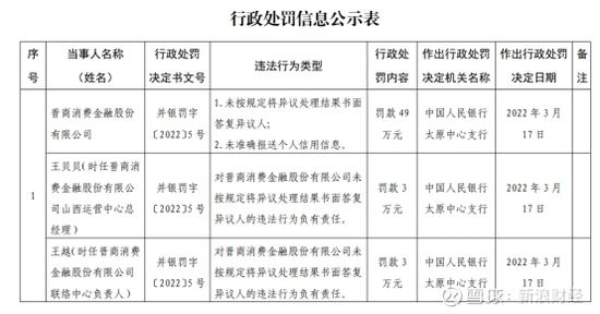随后,在2021年4月8日、5月25日,央行太原中心支行先后两次约谈了晋商消金相关责任人;2019年,晋商消金因违反《征信业管理条例》第四十条相关规定,被责令限期改正,并对单位处以罚款人民币50方元;对直接负 责的主管人员处以罚款人民币5万元;2022年3月,晋商消金再被罚款49万元,违法事实明确列为未按规定将异议处理结果书面答复异议人和未准确报送个人信用信息。时任高管同步被罚。