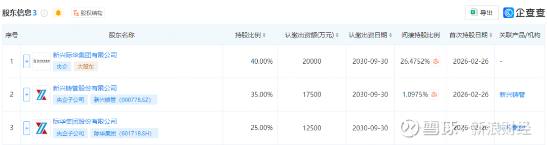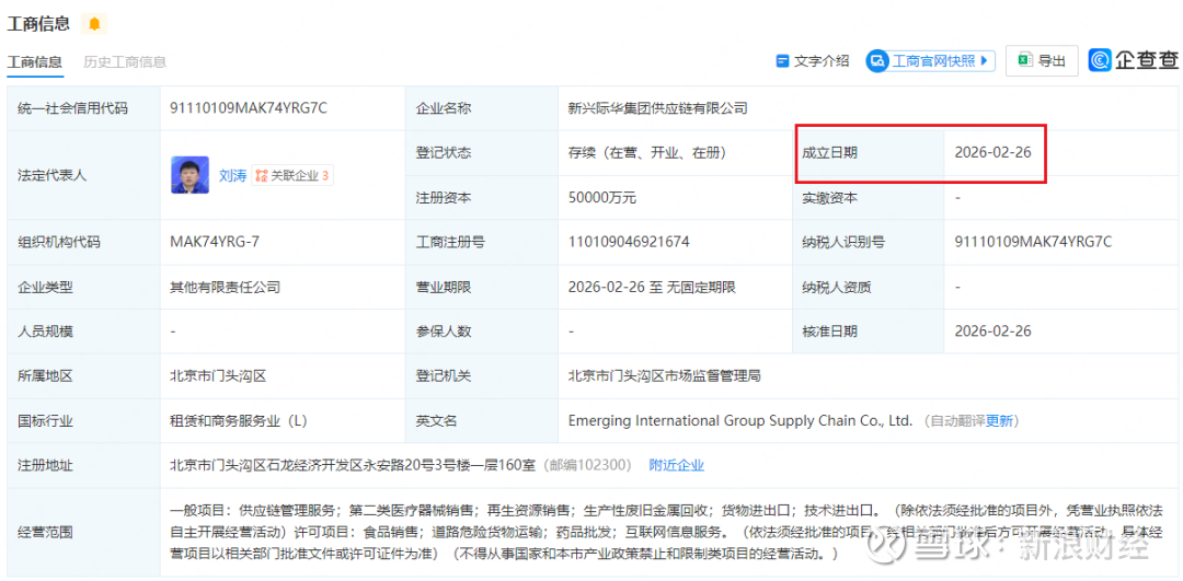 企查查信息显示,2026年2月26日,新兴际华集团供应链有限公司成立,注册资本5亿元,经营范围包含:供应链管理服务;第二类医疗器械销售;再生资源销售;生产性废旧金属回收等。企查查股权穿透显示,该公司由新兴铸管、际华集团等共同持股。