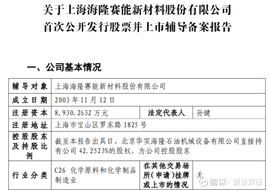 3月1日,中国证监会官网披露信息显示,中信建投证券已向监管部门提交《关于上海海隆赛能新材料股份有限公司首次公开发行股票并上市辅导备案报告》,标志着上海海隆赛能新材料股份有限公司正式启动A股上市辅导。