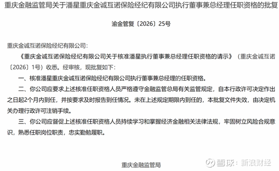 2026年3月5日,国家金融监督管理总局重庆监管局官网发布任职批复,正式核准潘星担任重庆金诚互诺保险经纪有限公司(下称“金诚互诺”)执行董事兼总经理的任职资格。