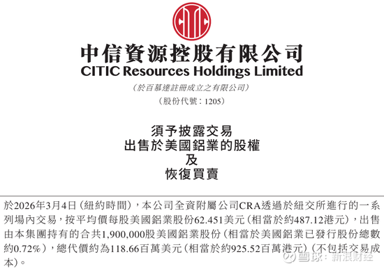 3月5日晚间,中信资源公告称,于纽约时间2026年3月4日,旗下全资附属公司CRA通过在纽交所进行的一系列场内交易,以平均每股62.451美元的价格出售190万股美国铝业(AA.US)股份,约占美国铝业已发行股份总数的0.72%,交易总代价约为1.19亿美元(约合9.26亿港元),不包括交易成本。