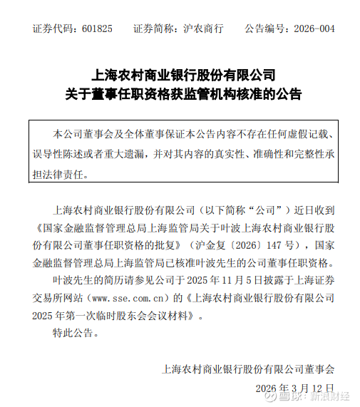 3月11日金融一线消息,沪农商行发布公告称,公司日收到《国家金融监督管理总局上海监管局关于叶波上海农村商业银行股份有限公司董事任职资格的批复》(沪金复〔2026〕147号),国家金融监督管理总局上海监管局已核准叶波的公司董事任职资格。