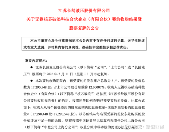 3月11日,江苏长龄液压股份有限公司(605389)复牌。随着要约收购结果公布,这家江苏液压设备企业的一场控制权接力,也基本落下阶段性帷幕。