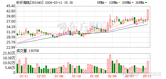 证券时报·数据宝统计显示,中环海陆今日收盘价为43.25元,上涨13.76%,日换手率为13.87%,成交额为5.30亿元,全天主力资金净流入311.06万元,近5日该股累计上涨16.33%,近5日资金合计净流出2171.77万元。
