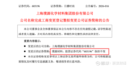 日播时尚(603196)公告称,公司全称已由“日播时尚集团股份有限公司”变更为“上海璞源化学材料集团股份有限公司”,证券简称拟由“日播时尚”变更为“璞源材料”,证券代码保持不变。