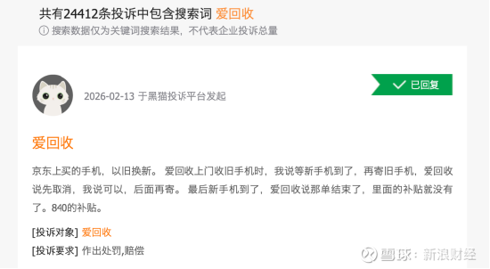 线下门店作为爱回收最重的资产,不仅是流量的入口,更是信任的背书。但在快速扩张的过程中,管理半径的拉大、人员培训的滞后,导致服务质量参差不齐。在黑猫投诉平台上,以“爱回收”为关键词的消费者投诉累计已接近2.5万条。这一数字本身,已成为悬挂在爱回收品牌形象上的一把达摩克利斯之剑。
