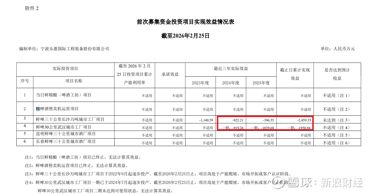 来源:公告 截至2026年2 月25日,已完工的鲜啤三十公里长沙万吨城市工厂项目,2023—2025年累计实现的效益分别为1140.59 万元、-922.21万元、-396.55万元,三年累计亏损2459.35万元。而鲜啤30公里武汉城市工厂项目(一期)2024年度、2025年度的效益分别为:-919.26万元、-1039.68万元,累计-1958.94万元。