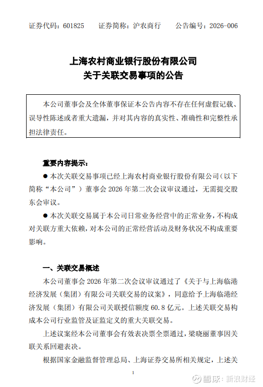 3月13日金融一线消息,沪农商行发布公告称,公司同意给予上海临港经济发展(集团)有限公司关联授信额度60.8亿元。公告显示,临港集团为沪农商行董事担任董事的企业,属于沪农商行行业监管及证监定义的关联方。