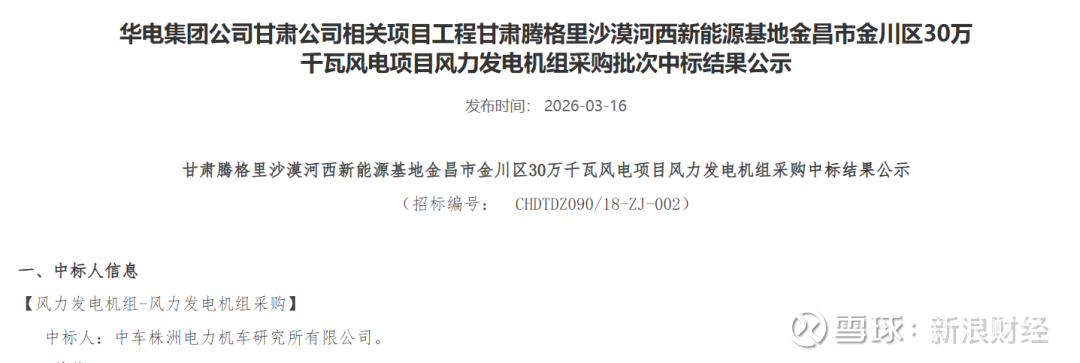3月16日,中国华电集团电子商务平台发布《甘肃腾格里沙漠河西新能源基地金昌市金川区30万千瓦风电项目风力发电机组采购中标结果公示》的公告。