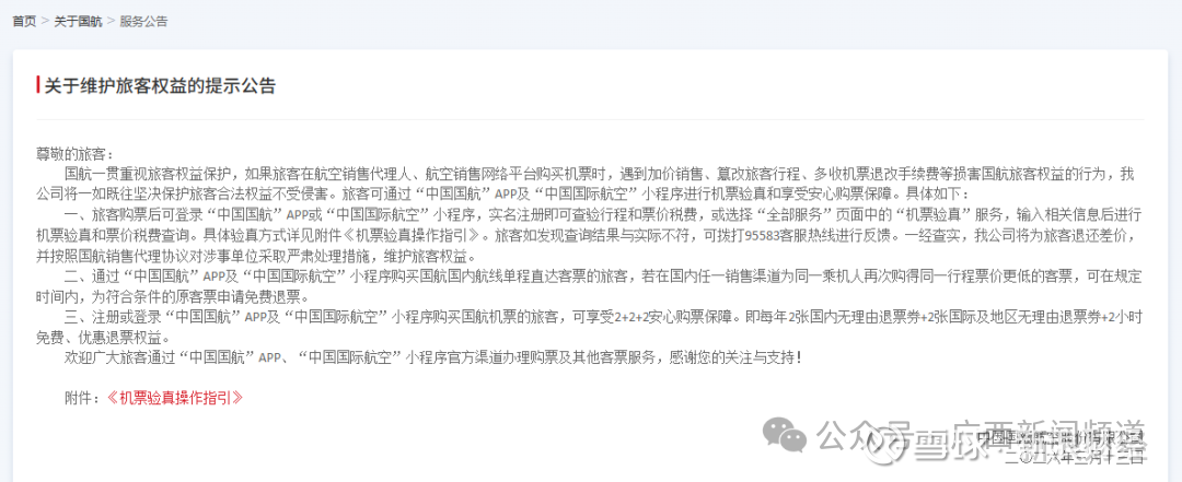一、旅客购票后可登录“中国国航”App或“中国国际航空”小程序,实名注册即可查验行程和票价税费,或选择“全部服务”页面中的“机票验真”服务,输入相关信息后进行机票验真和票价税费查询。具体验真方式详见附件《机票验真操作指引》。旅客如发现查询结果与实际不符,可拨打95583客服热线进行反馈。一经查实,我公司将为旅客退还差