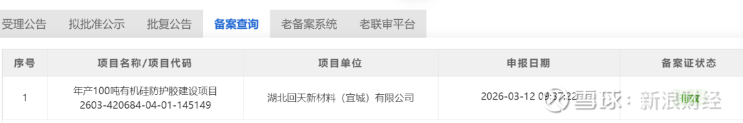 3月12日,湖北政务服务网发布了湖北回天新材料(宜城)有限公司年产100吨有机硅防护胶建设项目备案的信息。