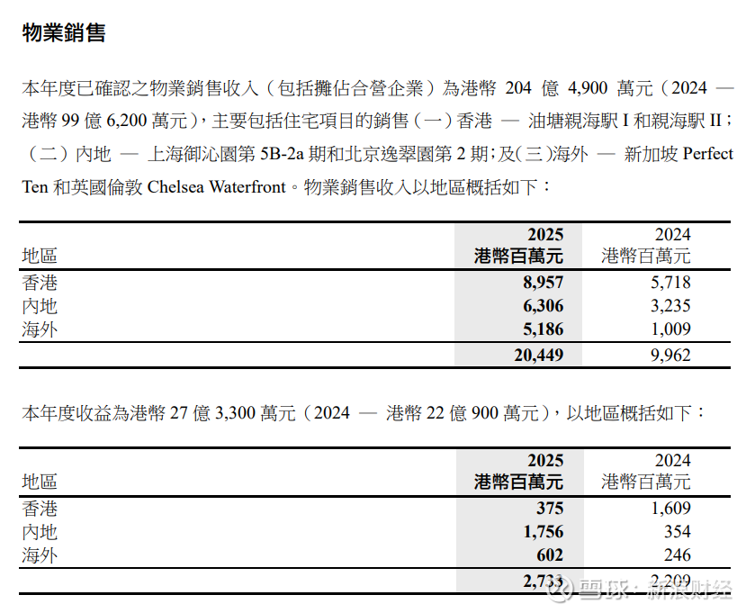 业绩方面,整体物业销售收入204.49亿元,按年增长105%;收益27.33亿元,按年增长23.7%。惟香港物业销售收益375亿元,大减76.7%。