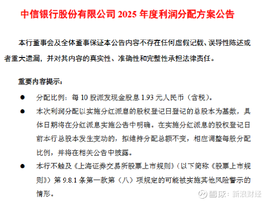 3月20日金融一线消息,中信银行今日发布《2025年度利润分配方案公告》,拟每 10 股派发现金股息 1.93 元人民币(含税)。