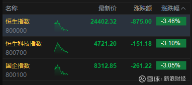 3月23日消息,港股三大指数集体下跌。截至午间收盘,恒生指数跌3.46%,报24402.32点,恒生科技指数跌3.1%,国企指数跌3.05%。盘面上,科网股普跌,哔哩哔哩跌超6%,百度跌超5%,京东跌超4%,网易、小米、快手、阿里巴巴、联想跌超3%;航空股下挫,东方航空跌超10%;黄金股集体下跌,赤峰黄金跌近25%;保险股跌幅居前,新华保险跌超8%;今日两只新股上市,飞速创新涨超11%,国民技术涨超15%。