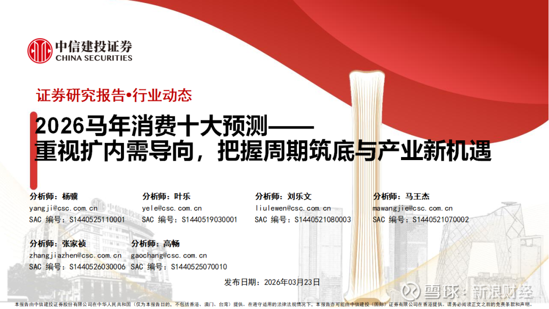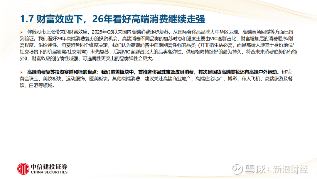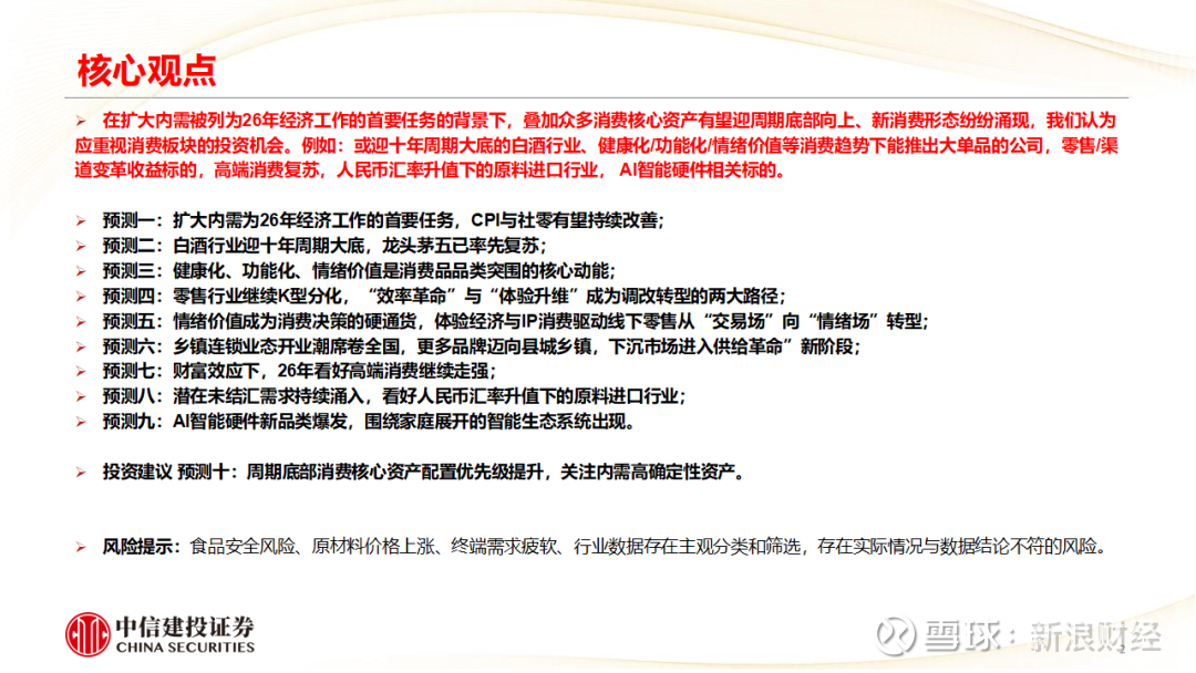 在扩大内需被列为2026年经济工作的首要任务的背景下,叠加众多消费核心资产有望迎周期底部向上、新消费形态纷纷涌现,我们认为应重视消费板块的投资机会。例如:或迎十年周期大底的白酒行业、健康化/功能化/情绪价值等消费趋势下能推出大单品的公司,零售/渠道变革收益标的,高端消费复苏,人民币汇率升值下的原料进口行业, AI智能硬件相关标的。