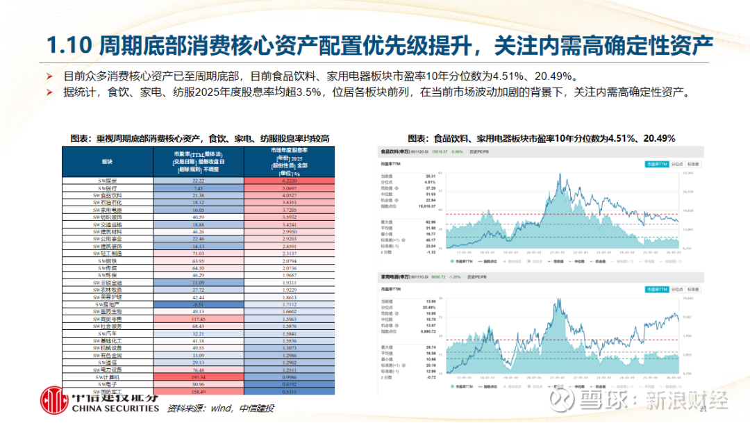 投资建议 预测十:周期底部消费核心资产配置优先级提升,关注内需高确定性资产。