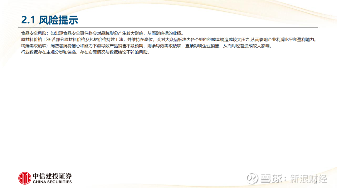 原材料价格上涨:若部分原材料价格及包材价格持续上涨,并维持在高位,会对大众品板块内各个标的的成本端造成较大压力,从而影响企业利润水平和盈利能力。