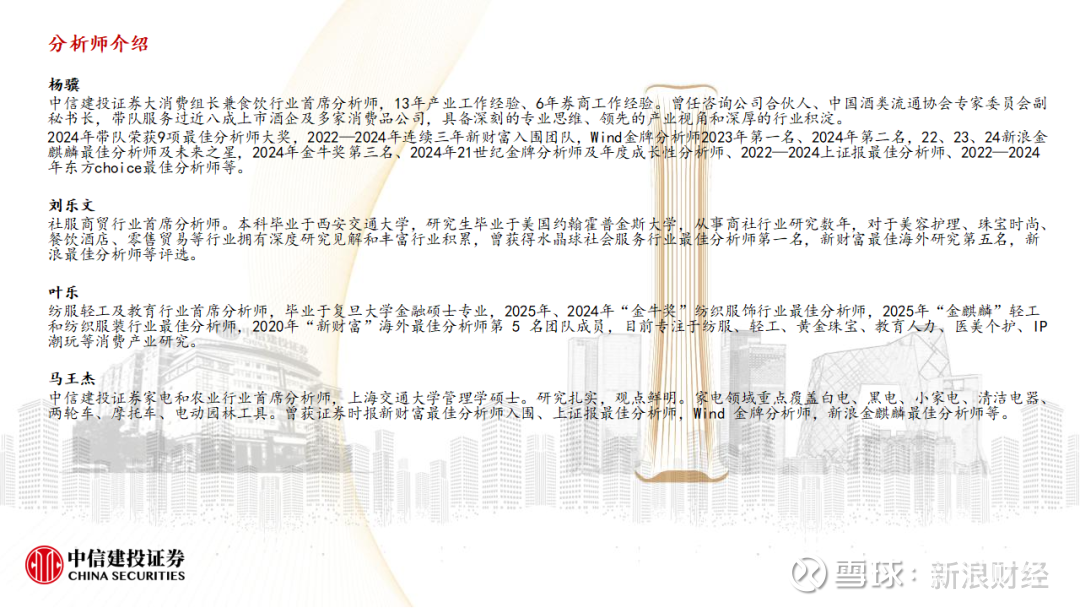 杨骥:中信建投证券大消费组长兼食饮行业首席分析师,13年产业工作经验、6年券商工作经验。曾任咨询公司合伙人、中国酒类流通协会专家委员会副秘书长,带队服务过近八成上市酒企及多家消费品公司,具备深刻的专业思维、领先的产业视角和深厚的行业积淀。2024年带队荣获9项最佳分析师大奖,2022—2024年连续三年新财富入围团队,Wind金牌分析师2023年第一名、2024年第二名,22、23、24新浪金麒麟最佳分析师及未来之星,2024年金牛奖第三名、2024年21世纪金牌分析师及年度成长性分析师、2022—2024上证报最佳分析师、2022—2024年东方choice最佳分析师等。