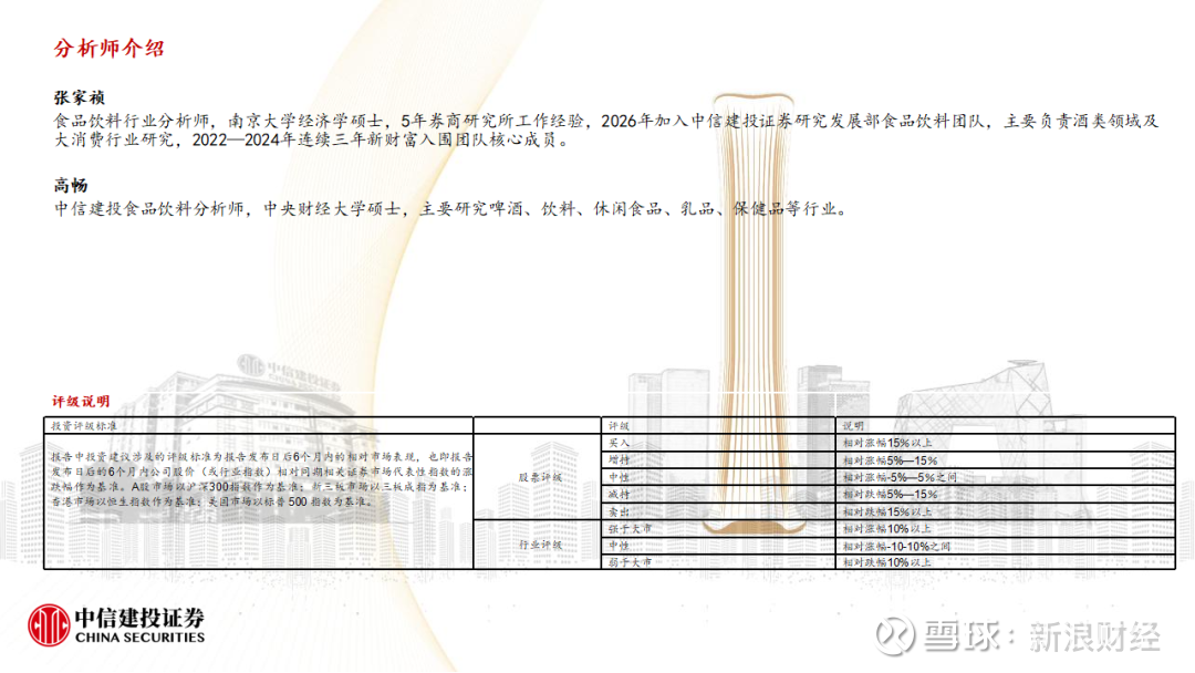 张家祯:食品饮料行业分析师,南京大学经济学硕士,5年券商研究所工作经验,2026年加入中信建投证券研究发展部食品饮料团队,主要负责酒类领域及大消费行业研究,2022—2024年连续三年新财富入围团队核心成员。