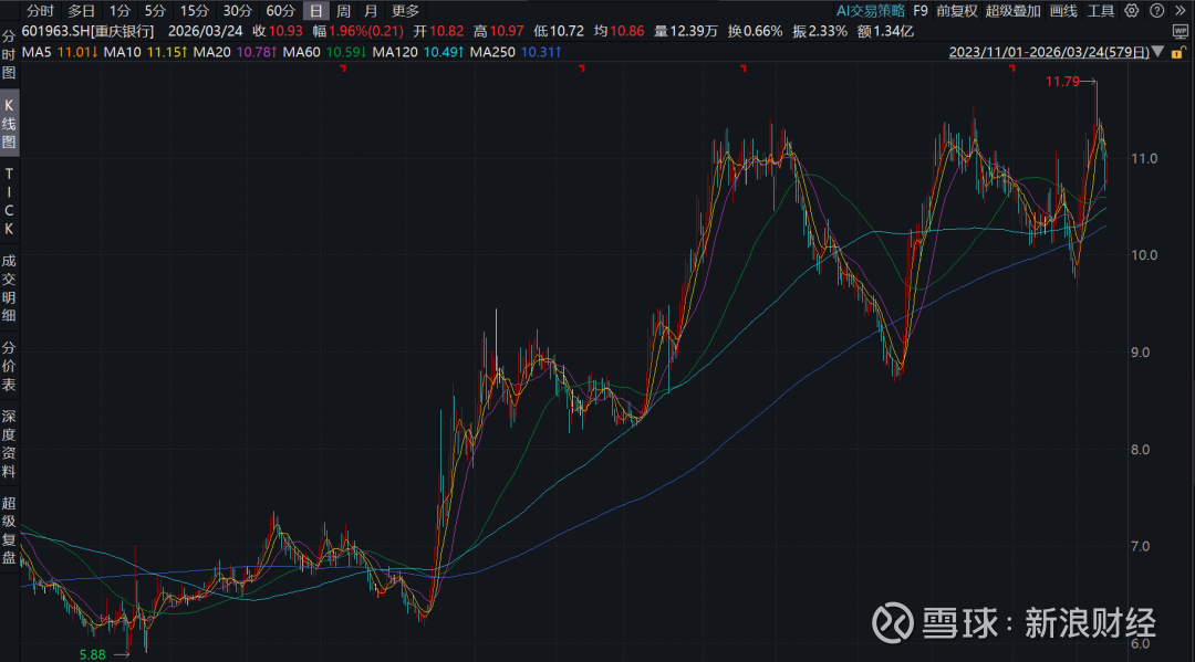 3月24日,对于重庆银行(601963.SH)而言,必然是扬眉吐气的一天。在历经多年经营调整和波折洗礼后,这家扎根于西部地区的城商行,昨日已交出了一份强劲的业绩答卷。而随着年度成绩单公之于众,机构之家注意到,重庆银行股价也已回升至历史阶段性高点。这一亮眼的股价表现,也隐含着市场对该行后续发展的乐观期待。