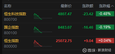 3月25日消息,港股三大指数高开低走。截至午间收盘,恒生指数涨0.04%,报25072.75点,恒生科技指数跌0.48%,国企指数跌0.19%。盘面上,科网股涨跌不一,京东涨超1%,小米跌超3%,百度跌超2%,腾讯、哔哩哔哩、快手跌超1%;核电股涨幅居前,中核国际涨超8%;航空股继续反弹,东方航空涨超2%;餐饮股跌幅居前,海底捞跌超10%。