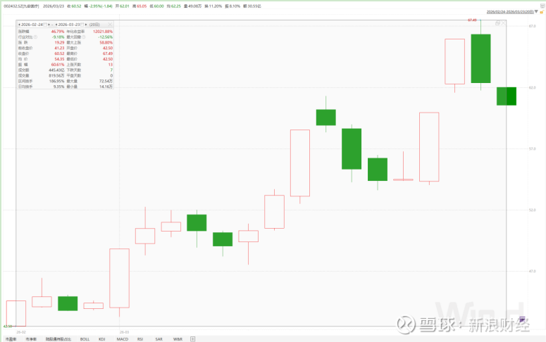 据数据统计,仅2026年2月24日—3月23日这20个交易日,九安医疗的股价大幅上涨46.79%,与同期公司所处行业指数下跌9.18%形成鲜明对比。