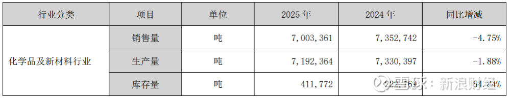 从产销量来看,2025年公司化学品及新材料整体销售量同比下降4.75%至700.34万吨,生产量同比下降1.88%至719.24万吨,而期末库存量则同比大增84.84%,达到41.18万吨。销售量下滑而产量调整滞后,导致公司进入被动累库阶段,这也从侧面印证了下游需求偏弱与供给端产能释放带来的短期供需错配压力。