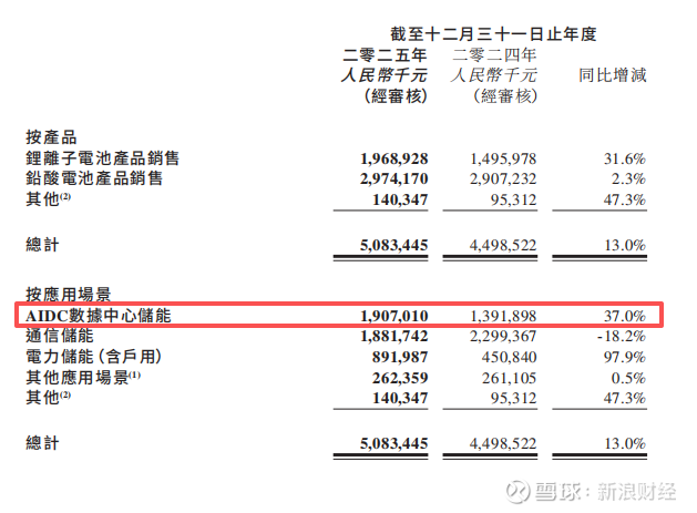 最直观的变化是,AIDC智算中心储能已超越通信储能,跃升为公司第一大收入来源。2025年,该板块收入达到19.07亿元,同比增长37%。其中,应用于AIDC智算中心储能锂电池收入更是迎来爆发式增长,同比激增598.3%,销量增长531.8%,印证了AI算力需求对储能的强劲拉动。