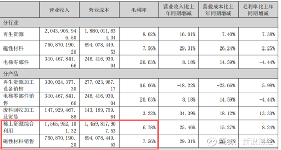 如今商誉减值风险得到部分出清,业绩的绝地反击,核心在于稀土业务的强劲复苏。从2025年上半年的收入构成来看,稀土资源综合利用板块也就是稀土回收利用业务占比达49.6%,毛利率为6.8%;磁性材料板块占比23.8%,毛利率为7.6%。