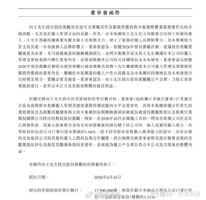 函件建议向王一博授出1250万个受限制股份单位,认购价每股0.01港元,占已发行股份约1.51%,相关激励需待股东特别大会审议通过后方可生效。