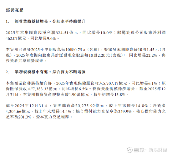 3月26日金融一线消息,中国人保发布截至2025年12月31日止年度业绩,该集团期内取得营业总收入6692.54亿元(人民币,下同),同比增加7.56%;归属于母公司股东净利润462.07亿元,同比增加9.62%;每股基本收益1.04元;拟派发末期股息每10股1.45元。