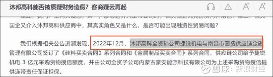 我们进一步追踪发现,2023年,南昌市国资供应链金融管理有限公司新增为公司光伏业务的第一大供应商,当年交易金额高达4.66亿元,交易额占比高达32.28%,主要交易产品为硅料。我们根据相关公告追溯发现,2022年12月,沐邦高科全资孙公司捷锐机电与南昌市国资供应链金融管理有限公司签订了《硅料买卖合同》系列合同和《金属制品买卖合同》系列合同,供应链公司给予捷锐机电 3 亿元采购货物授信额度,并由公司全资子公司内蒙古豪安能源科技有限公司为上述采购货物授信提供连带责任保证担保。对于该笔交易,我们在《沐邦高科能否被质疑财务造假?客商疑云再起》,直指其交易合理性,即南昌市国资供应链金融管理有限公司是否属于供应链金融公司?公司与其进行硅料采购交易又是否合理?