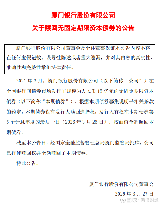 3月27日金融一线消息,厦门银行公告,2021年3月,该行在全国银行间债券市场发行了规模为15亿元的无固定期限资本债券(以下简称“本期债券”)。根据本期债券募集说明书相关条款的约定,本期债券设有发行人赎回选择权,发行人有权在本期债券第5个计息年度的最后一日(2026年3月26日),按面值全部赎回本期债券。
