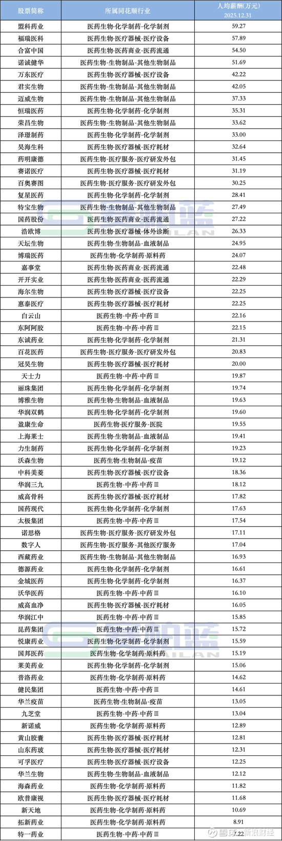 同花顺问财数据显示,截至目前,A股已有68家医药企业公布2025年人均薪酬。